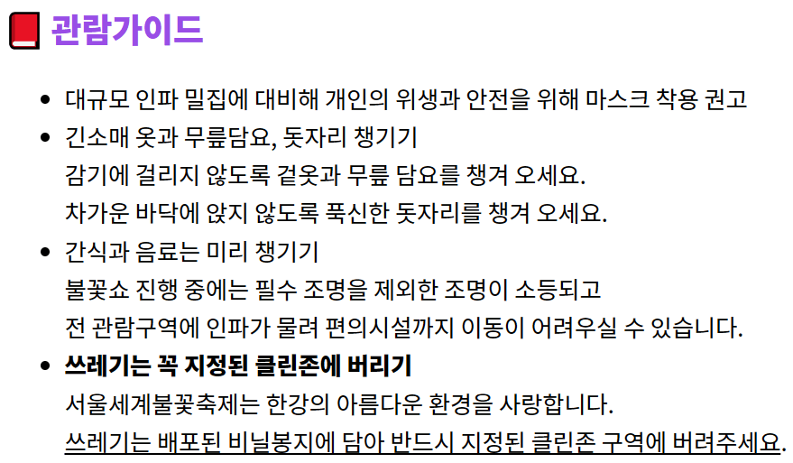 특히 많은 인파가 예상되는 만큼 사전 예약은 필수입니다. 불꽃놀이를 가장 잘 감상하려면 공식 티켓 홈페이지에서 미리 좌석을 예약하세요. 9월 2일에 예약이 시작됩니다. 좌석이 한정되어 있으므로 너무 오래 기다리지 마시고 빨리 예약하세요.